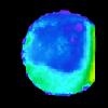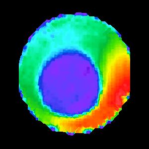 These images represent the Martian surface temperature as measured by the TES. The purple areas are the coldest, about -200°F (140K), while the red areas are the warmest at about 30°F (270K). Click on the image for a larger version.