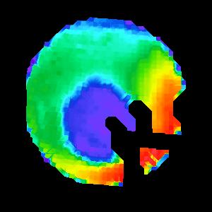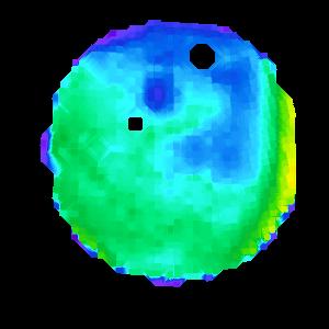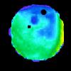 These images represent the Martian surface temperature as measured by the TES. The purple areas are the coldest, about -200°F (140K), while the red areas are the warmest at about 30°F (270K). Click on the image for a larger version.